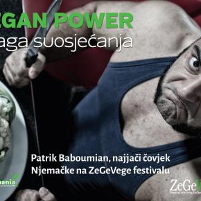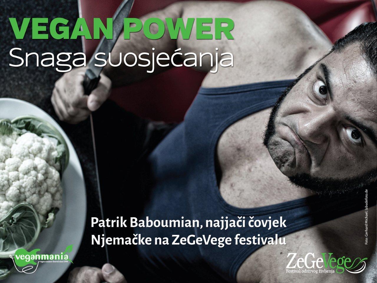 Ovaj simpatičan Nijemac, na vizualima koji će biti postavljeni u Zagrebu, pozvat će sve na ZeGeVege festival koji će se, u organizaciji udruge Prijatelji životinja, održati u petak 4. rujna od 9 do 21 sat i u subotu 5. rujna 2015. od 9 do 19 sati. Baboumian će doći podržati zagrebačku Veganmaniju, ali neće bacati perilice rublja po Trgu bana Jelačića nego će govoriti o snazi veganstva. Osim što će na ZeGeVege festivalu predstaviti na štandu svoju knjigu ”How to Become a Vegan Badass” i biti dostupan za razgovor, 4. rujna u 20 sati održat će predavanje o svojim iskustvima te pokazati kako biti snažan i izdržljiv uz vegansku prehranu.