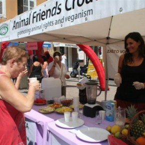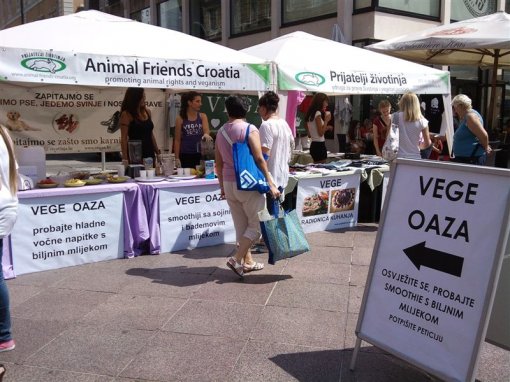 U riječkoj vege oazi u centru grada građani će se moći osvježiti i uživati u hladnim sočnim smoothijima od voća i sojinog i bademovog mlijeka, zaslađenima agavinim sirupom. Također, moći će saznati na štandu kako se jednostavno radi bademovo mlijeko te vidjeti postupak izrade bademovog mlijeka i na zabavnom filmu koji će se prikazivati. Aktivisti će dijeliti i recepte za smoothije, sladolede i ostale hladne veganske deserte te informativne materijale. Građani će se moći educirati kako mogu jednostavnim svakodnevnim osobnim angažmanom pomoći životinjama. Potpisivat će se i peticija za uvođenje vegetarijanskih obroka u javne institucije.
