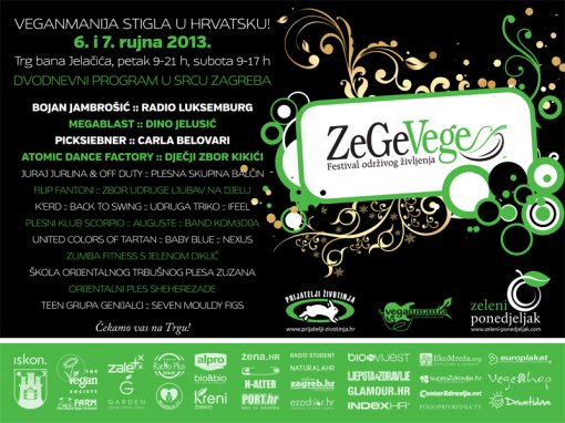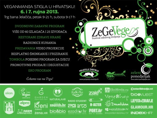 U petak, 6. rujna 2013. od 9 do 21 sat i u subotu, 7. rujna 2013. od 9 do 17 sati, na Trgu bana Jelačića u Zagrebu održat će se 6. ZeGeVege festival održivog življenja, u sklopu poznatog međunarodnog festivala Veganmanija. ZeGeVege festival, poznat po svojem vedrom i pozitivnom ozračju, otvorit će u petak, 6. rujna 2013. u 10 sati, kratkim pozdravnim govorom gradonačelnik Milan Bandić.